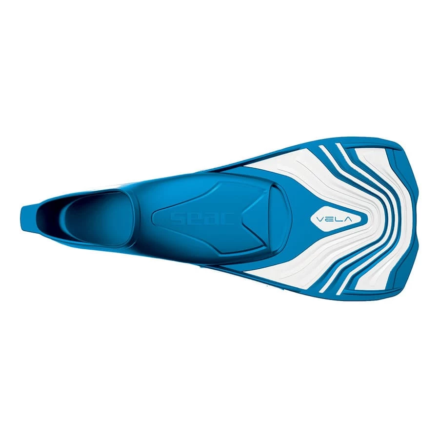 Die Seac Vela Schwimmflossen sind leicht verstellbar, die Flossen haben ein Verschlusssystem mittels eines hochelastischen und widerstandsfähigen Elastomer-Bandes. Schaufel aus einem speziellen Polyolefinharz und einer Fußtasche aus thermoplastischem Gummi.